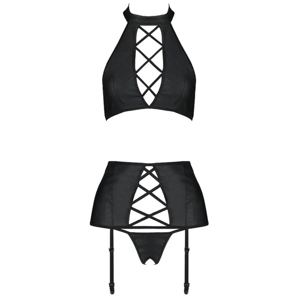El conjunto Nancy es un conjunto de tres piezas de Passion, que incluye una parte superior sujeta al cuello, liguero y tanga cortado con audacia. Todo esto está hecho de cuero negro, que está decorado con numerosas rayas cruzadas que revelan las cualidades femeninas. - Copas reforzadas con cables inferiores